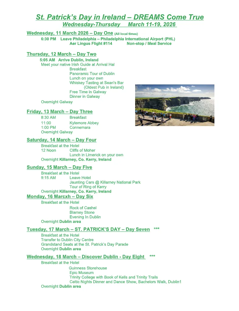 On March 11–19, 2026, join DeBolt Unlimited Travel for a once-in-a-lifetime journey from Philadelphia to Ireland to celebrate St. Patrick’s Day in Dublin — with reserved grandstand seats at the world-famous parade.